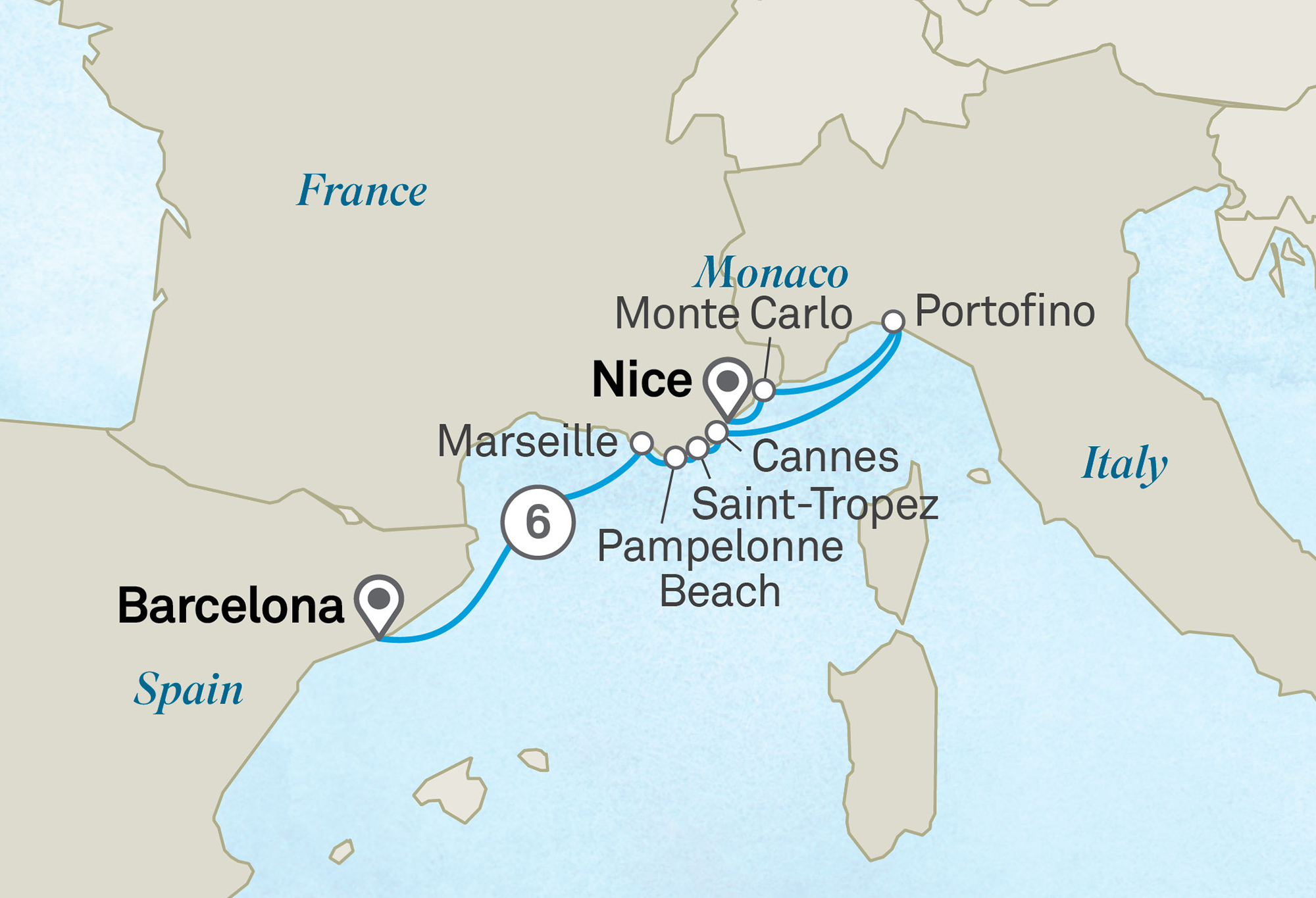 Fall in love with one of the world’s most famous coastlines, an iconic stretch of Mediterranean magic between Barcelona and Nice. Wander the ancient streets of Marseille, discover the bohemian art scene of Saint-Tropez, mingle with celebrities during the Cannes Film Festival, sample fresh seafood in Portofino and try your luck at the legendary Casino de Monte-Carlo. Sailing on board the ultra-luxury