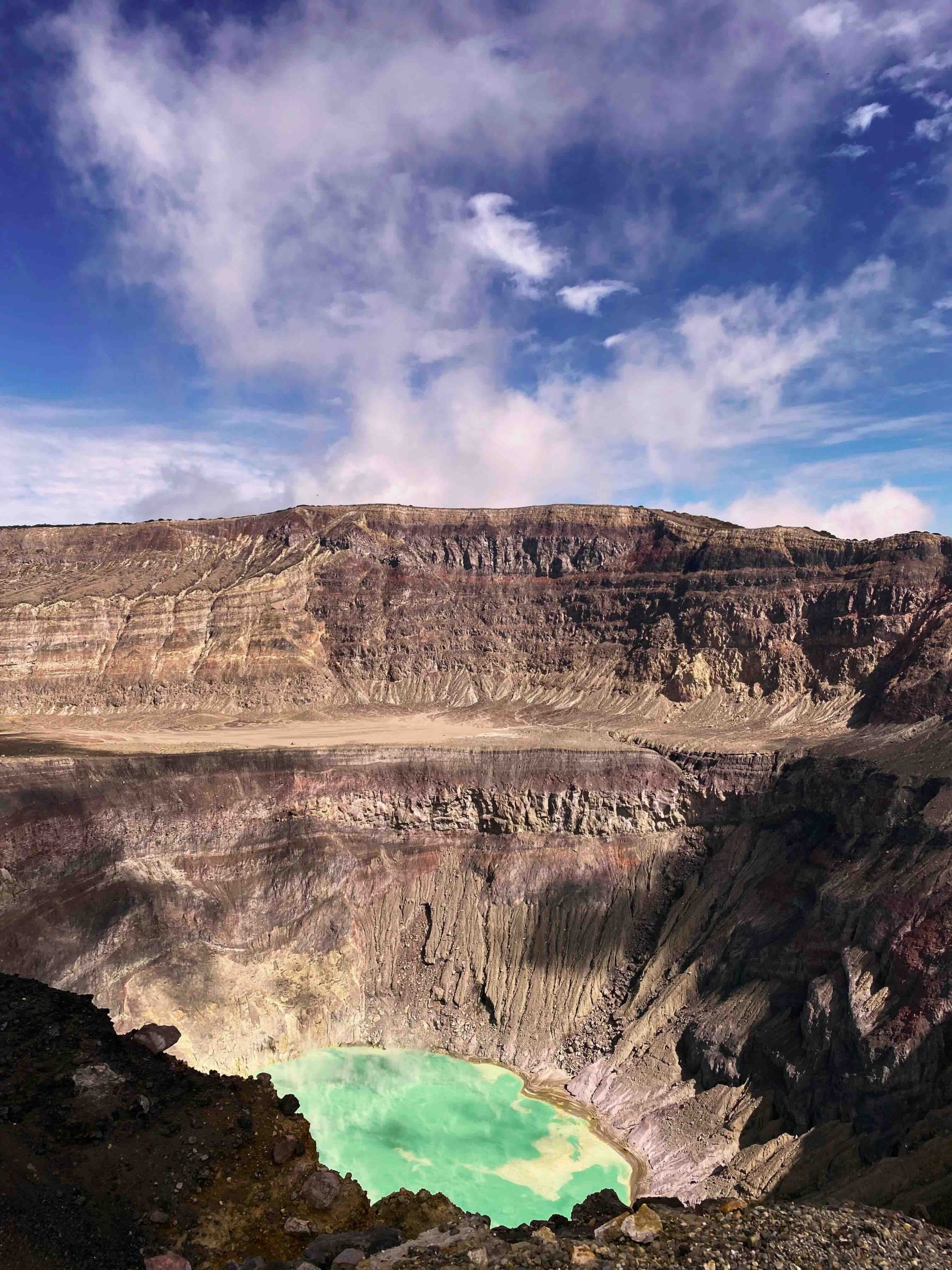 The Santa Ana Volcano (Ilamatepec) in El Salvador features a, vibrant, steaming, turquoise-colored sulfur lake within its active, 2,381-meter-high crater. By Luis Ortega