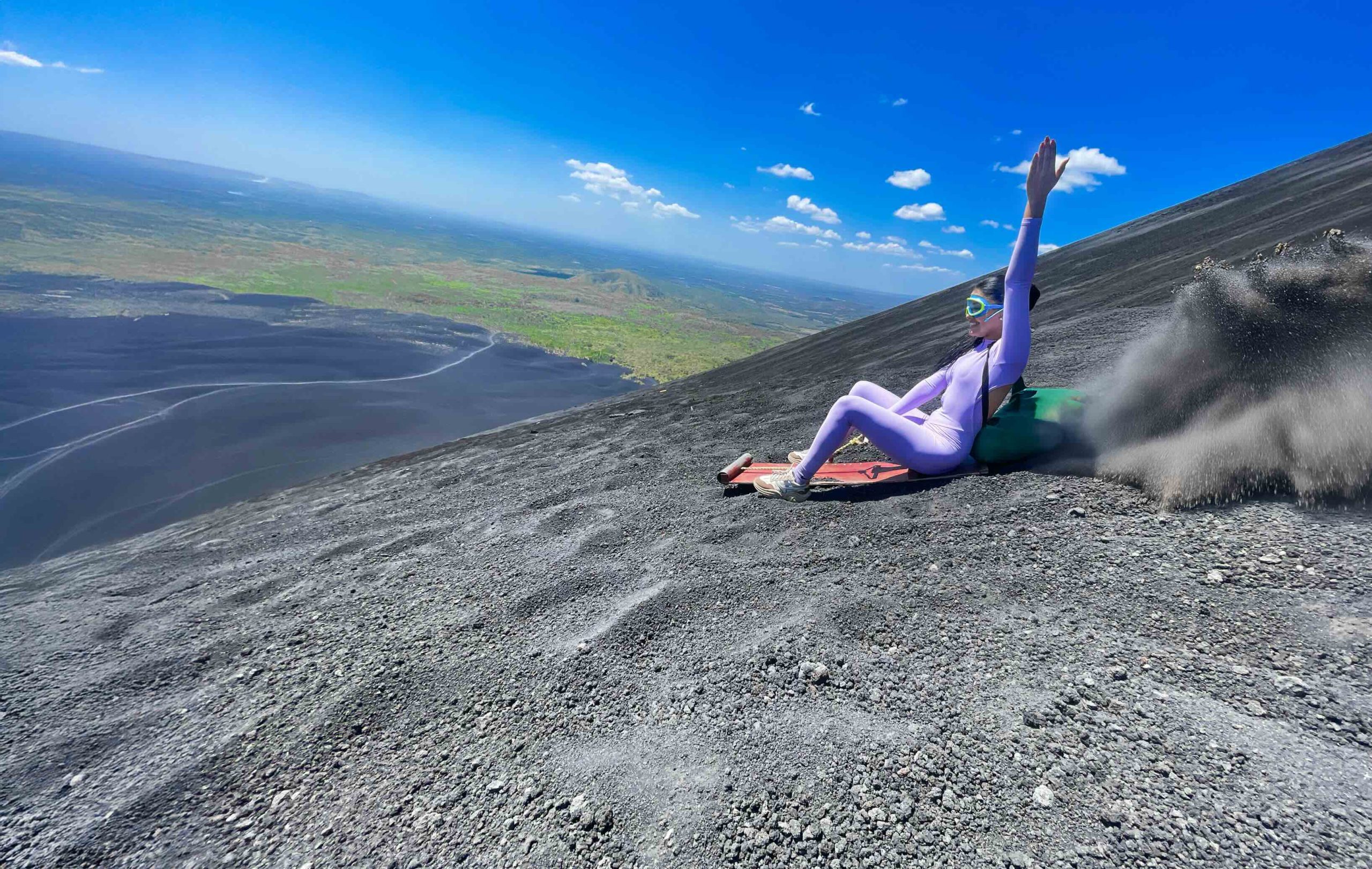 Thrill-seekers can turn up the heat at Cerro Negro, where “volcano boarders” hop onto toboggan-like wooden boards and race 400 metres down the cinder cone in mere minutes. Photo courtesy of Visit Nicaragua