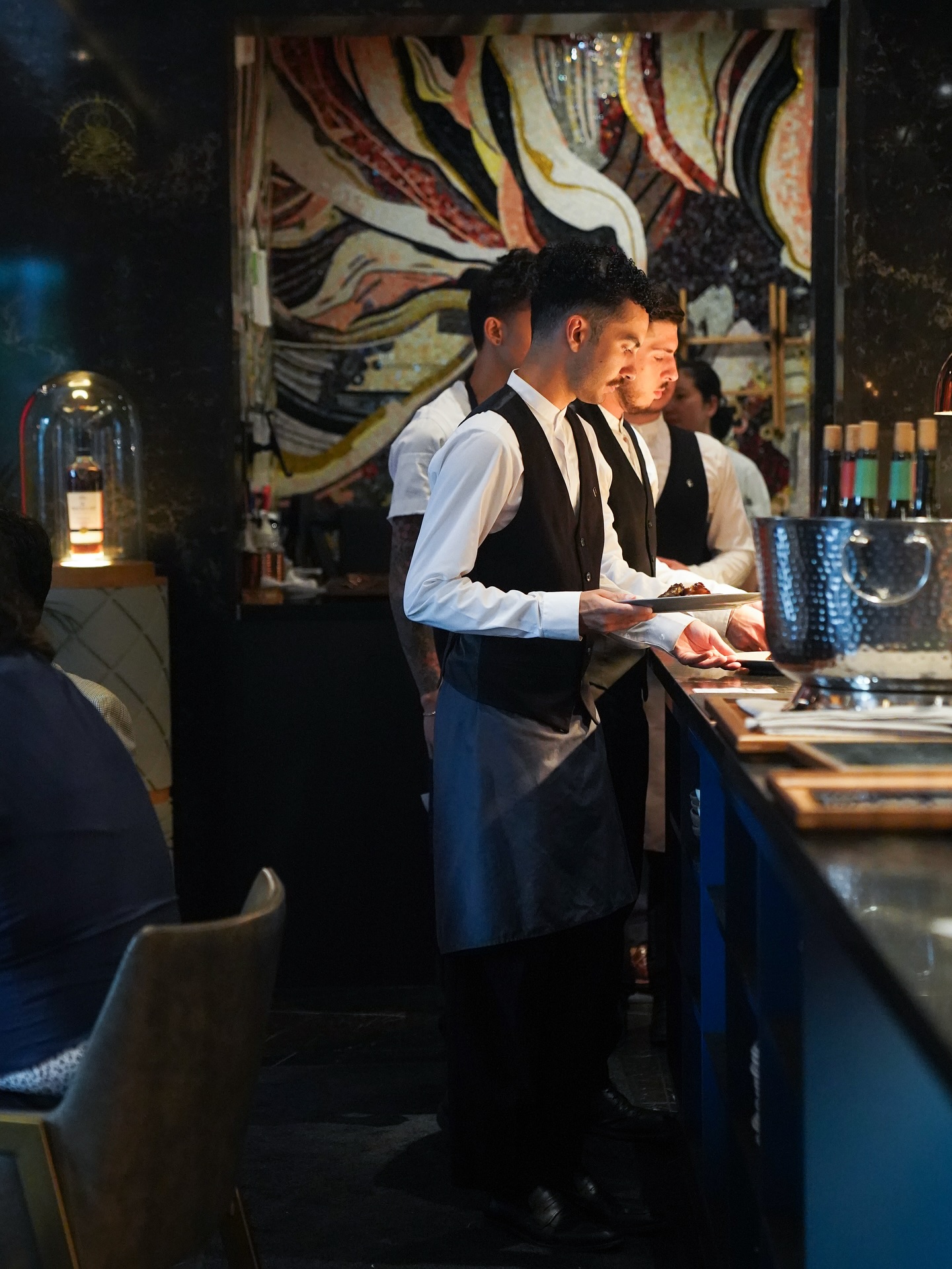 The open-concept kitchen hums with energy, chefs and staff moving in sync like a quietly orchestrated performance.