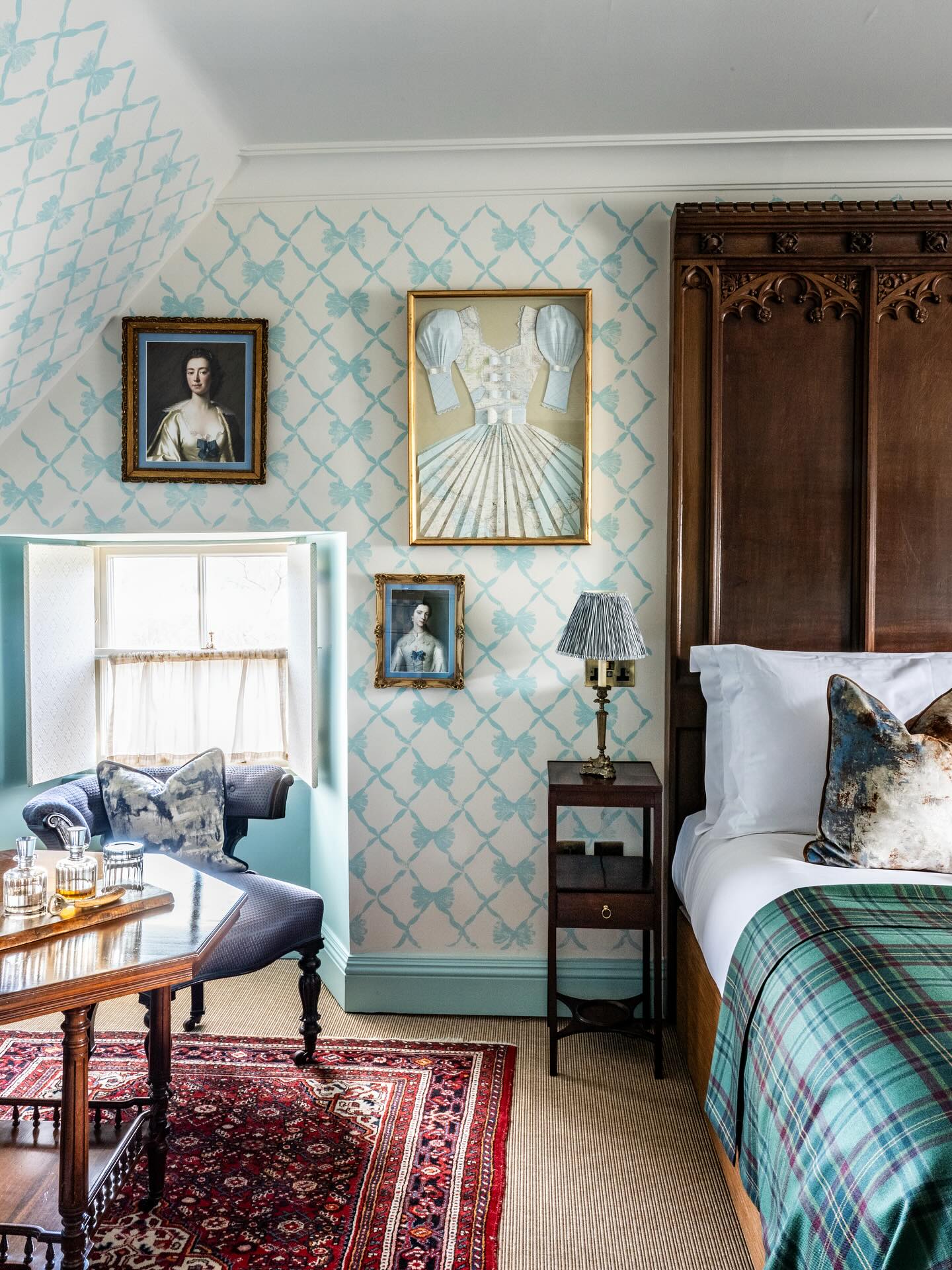 The Flora MacDonald room honours the Jacobite heroine who helped Bonnie Prince Charlie escape after Culloden, disguising him as her maid and rowing him to Skye. The design speaks in blue — the colour of loyalty — with ribbon motifs echoing Flora’s own allegiance, roses woven through for devotion and remembrance. Photo courtesy of The Fife Arms