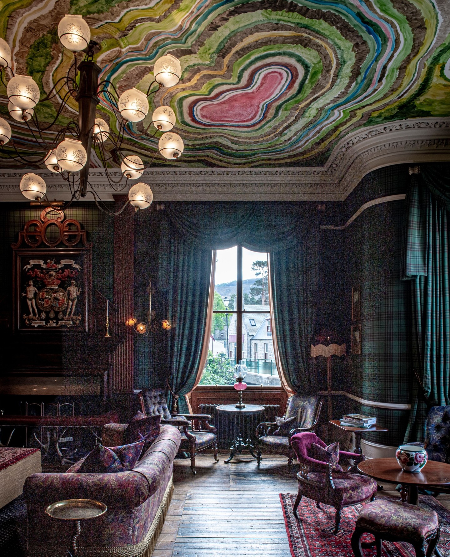In the Drawing Room, ‘Ancient Quartz’ by Zhang Enli sweeps across the wall. Inspired by the hidden worlds inside Scottish agates and Cairngorm crystal — as breathtaking as the Highlands themselves. Photo courtesy of The Fife Arms