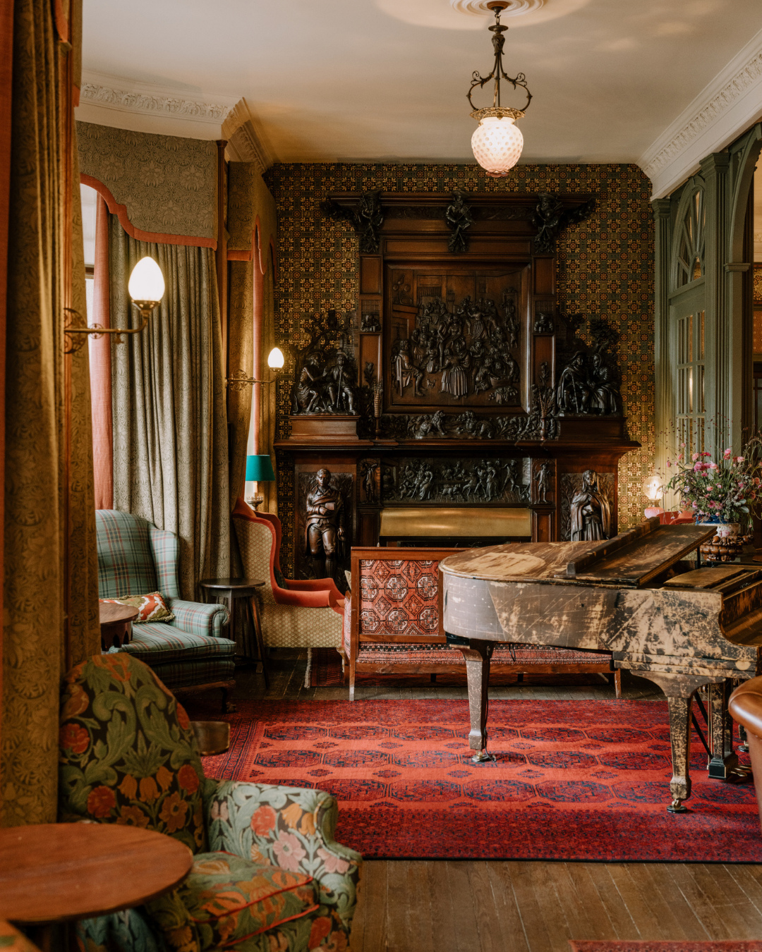 The Fife Arms lobby welcomes you to linger. Spot characters carved into the Robert Burns chimneypiece, listen to the Steinway, sign the guest book beneath Queen Victoria’s sketch of a stag, and look up — Richard Jackson’s ‘Red Deer Chandelier’ waits above. Photo courtesy of The Fife Arms