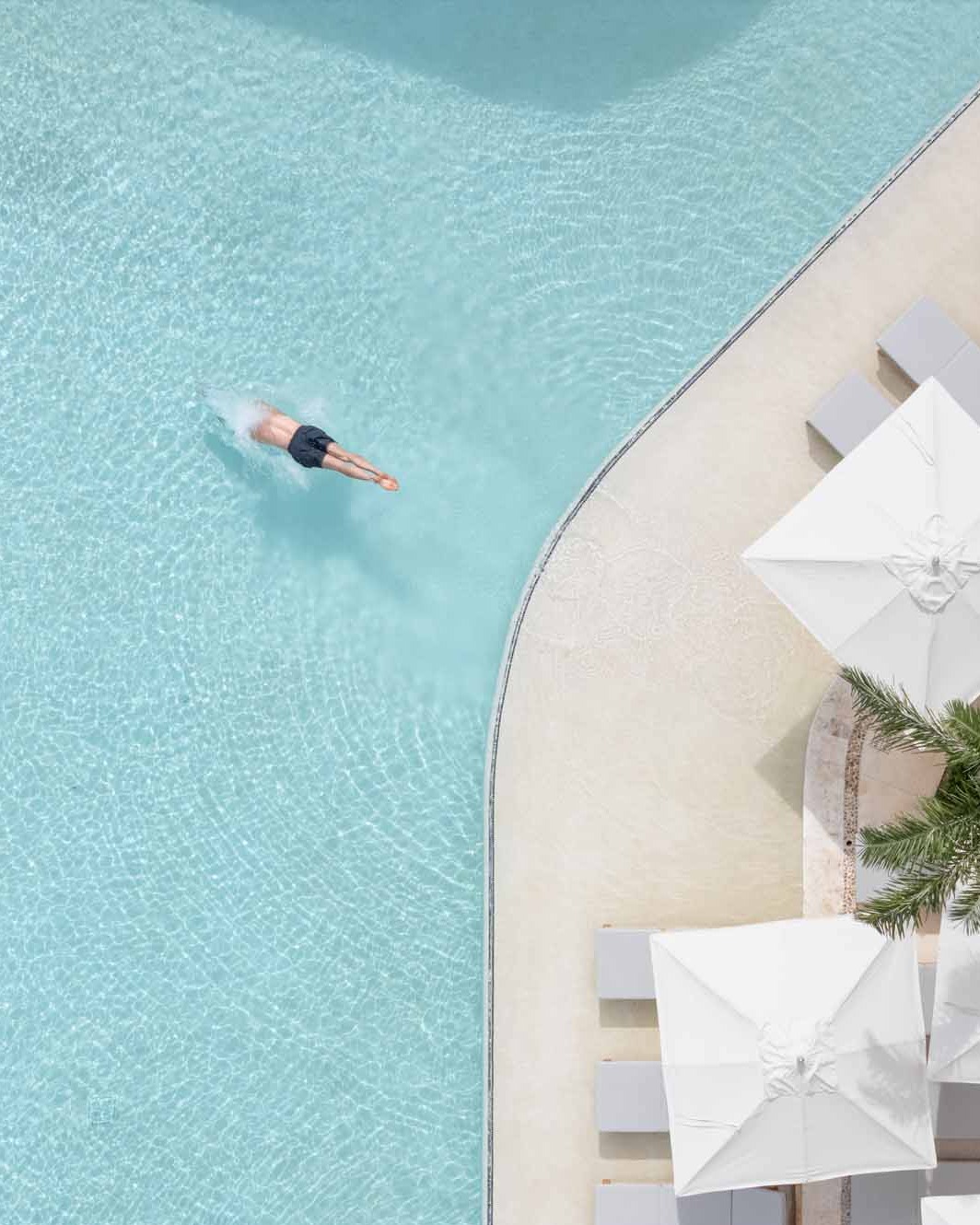 Everything you need is within reach: the beach cabanas are a few steps from the stylish lobby, the pool is seconds from the shoreline. The 109 suites continue the barefoot-chic theme introduced in the reception area. Neutral tones and natural woods are offset with gold finishes, the scene augmented with luxe linens and soft seating. Double-sided oval mirrors and a soaker tub separate the sleeping area from the open-concept bathroom, with a private shower and toilet.