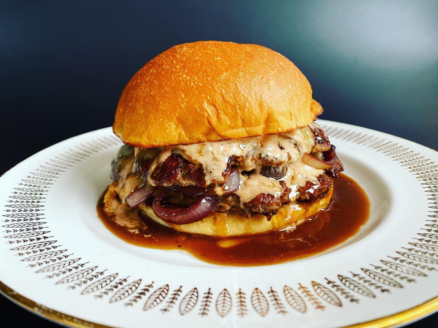 ‘Le Saucy French’ Burger: Double smash patties, red wine onions, gruyere, sauce remoulade, au jus, Bedard Bakery bun