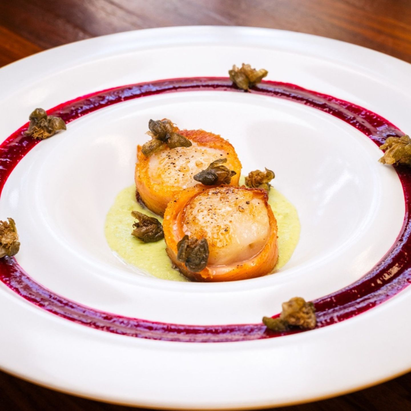 NS smoked salmon wrapped around Atlantic scallops and then seared & flamed with sherry.