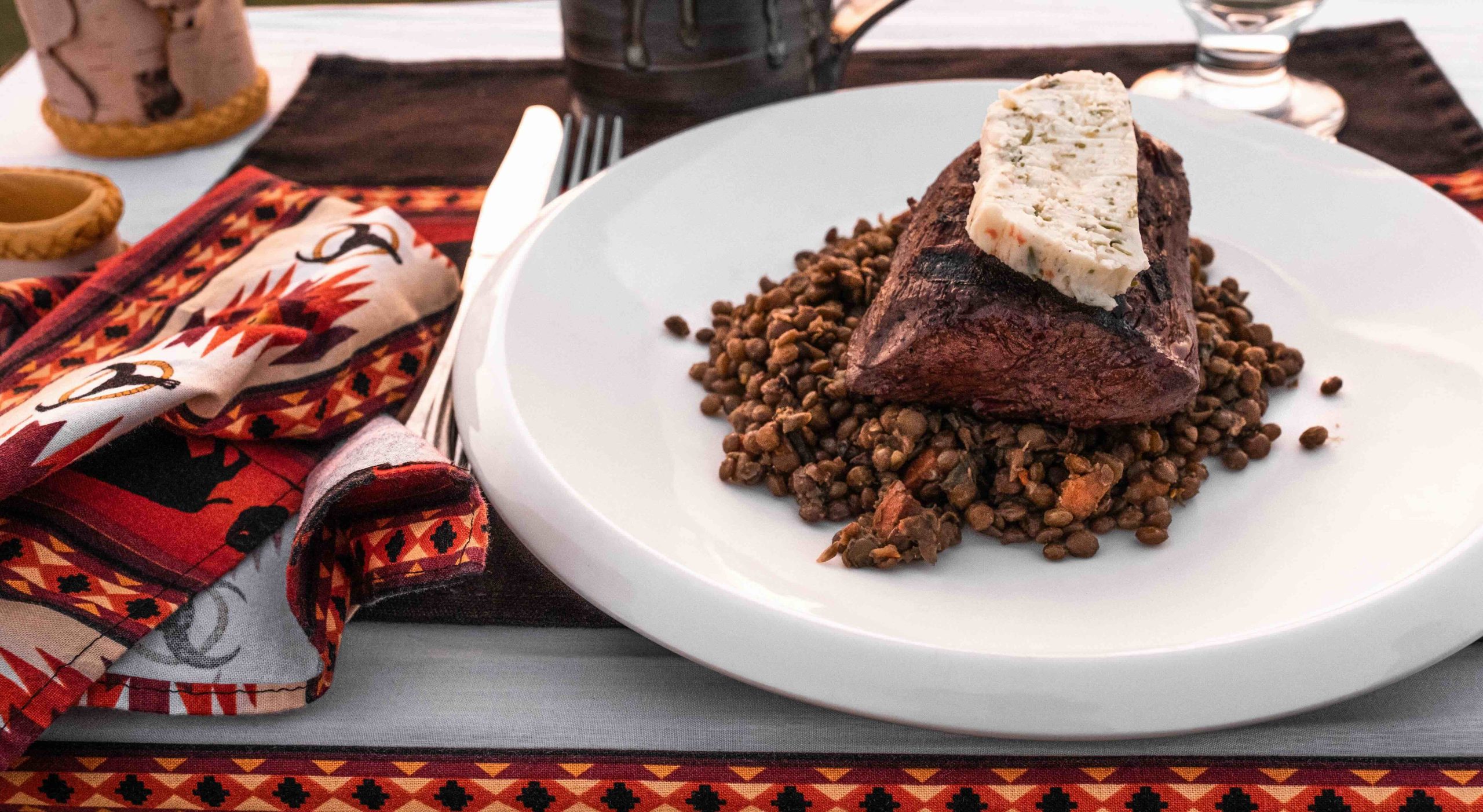 Métis chef Jenni Lessard’s Han Wi Moon Dinner: bison tenderloin with yarrow and sage, plus fry bannock with birch butter and chokecherry syrup. A taste of connection. Photo courtesy Tourism Saskatchewan